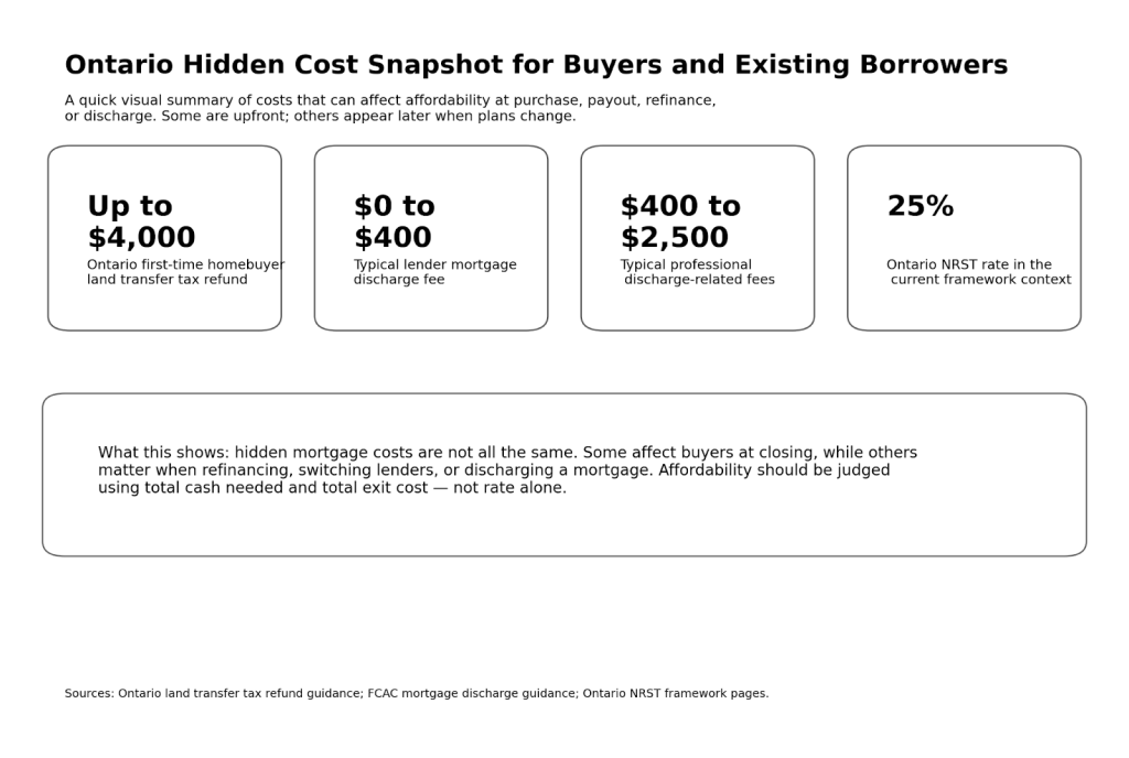 Disclaimer: This article is general information, not legal, tax, or financial advice. Mortgage costs vary by lender, province, property type, and borrower profile. Rules and fees may change, and your mortgage commitment and disclosure documents should always control.