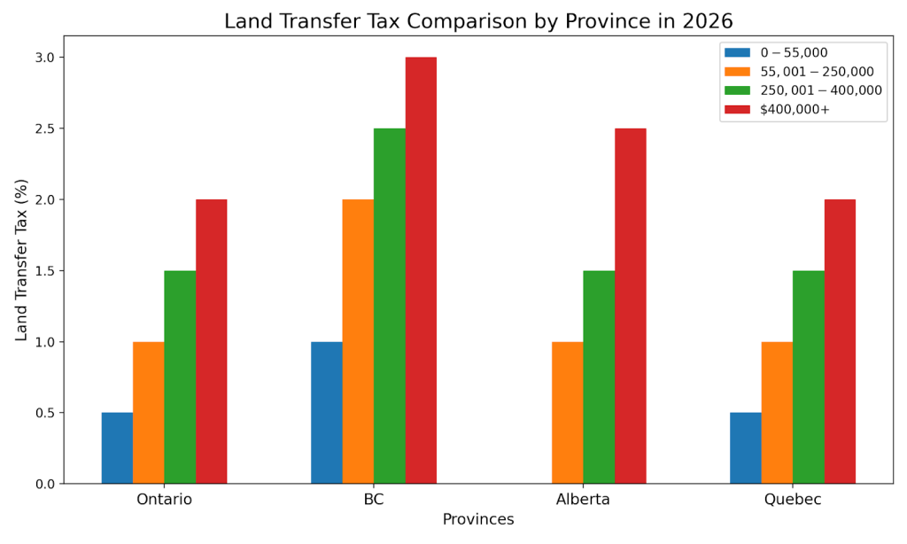 Ontario’s land transfer tax increases with the price of the property, but first-time homebuyers are eligible for rebates that reduce these costs. If you are in a higher income bracket and benefit from the tax savings in 2026, these savings can help offset some of the cost of land transfer tax. This is particularly important for buyers in Toronto, where land transfer taxes are higher. It’s essential to factor in both provincial and municipal land transfer taxes when budgeting for your home purchase.